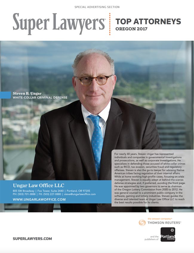 For nearly 40 years, Steven Ungar has represented individuals and companies, in governmental investigations and prosecutions, as well as corporate investigations. He specializes in defending those accused of white collar crimes such as RICO, tax evasion, securities fraud and regulatory offenses. Steven is also the go-to lawyer for advising Native American tribes facing regulation of their internal affairs. While at home in high profile cases, focusing on crisis management, Steven is equally adept at behind-the-scenes defense strategies, and if preferred, avoiding the front-page. Steven was appointed by two Governors to serve as Chairman of the Oregon Lottery Commission, from 2005 to 2012. He was General Counsel to a prominent public company in the software, gaming and lottery industries. Steven guides the diverse and talented team at Ungar Law Office LLC, to reach the best results possible for its clients.